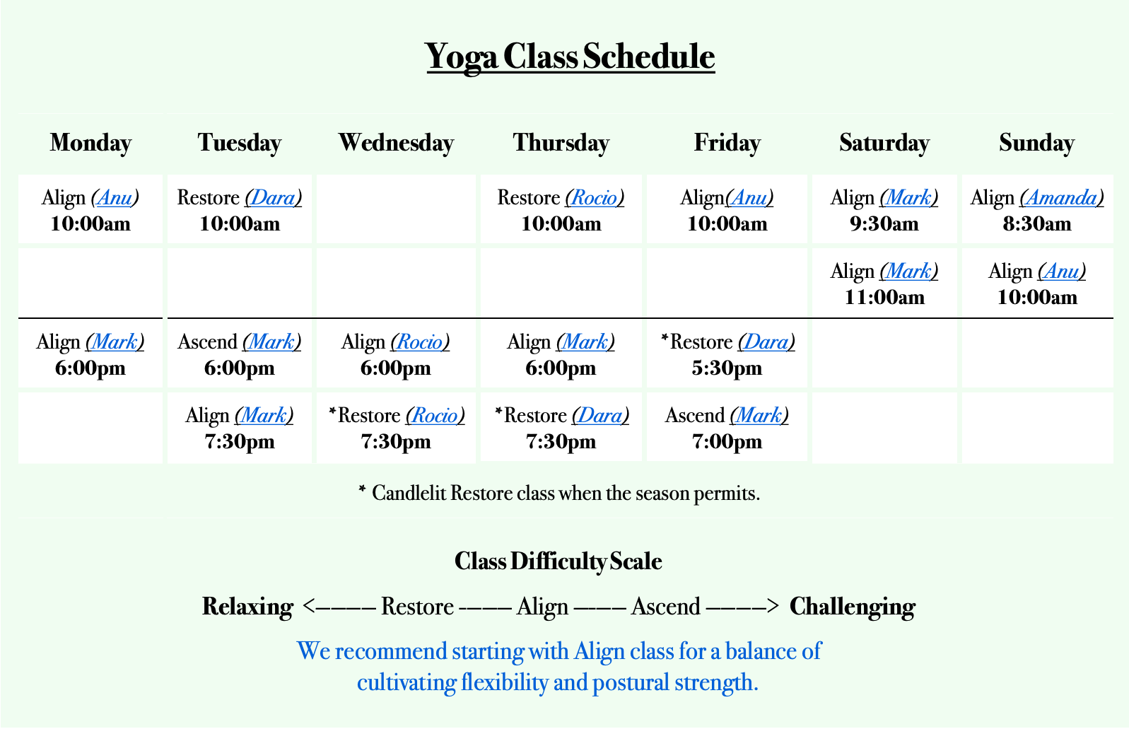 All classes are non-heated, and 60 min in length. Class sizes are kept to max 12 students.